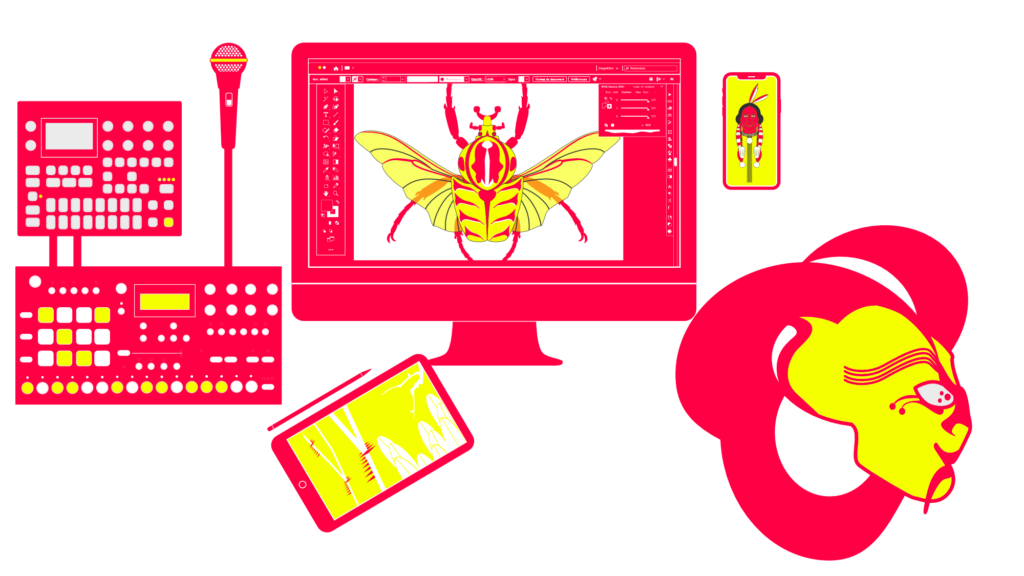 En parallèle de sa pratique musicale, Fabrice est également un créateur de visuels. Il réalise des supports de communication tels que des flyers, affiches, et webdesigns pour des événements et des artistes. Ses compétences en dessin vectoriel lui permettent de produire des illustrations numériques, à la fois pour sa propre communication et pour celles d’autres artistes avec lesquels il collabore.